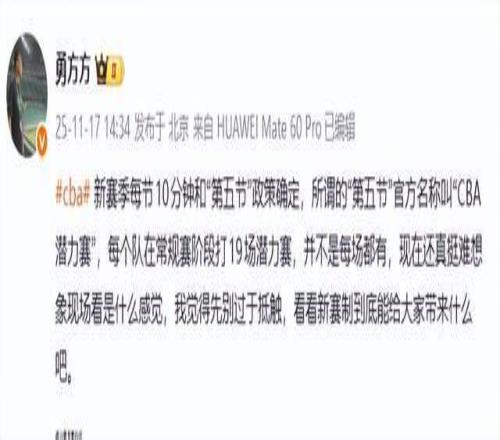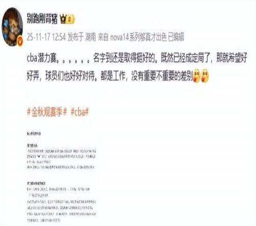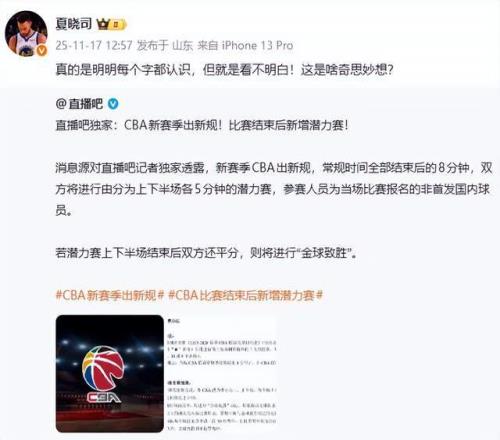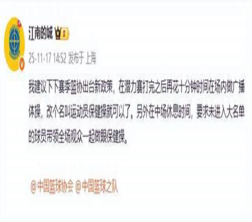 “江南的城”老师则连发2条动态,表达了自己的质疑,“潜力赛啊哈哈哈哈,职业篮球联赛还有第五节,下下赛季再加个第六节做完广播体操。