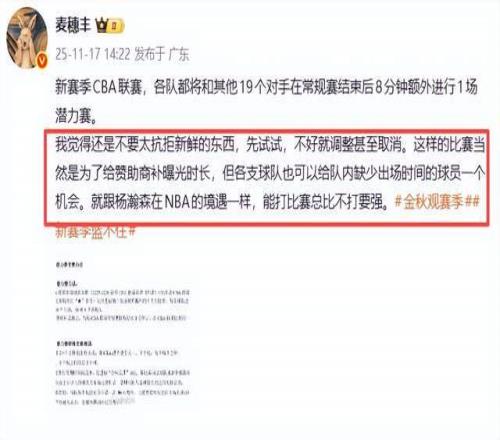 广东媒体人麦穗丰老师则表示,“我觉得还是不要太抗拒新鲜的东西,先试试,不好就调整甚至取消。这样的比赛当然是为了给赞助商补曝光时长,但各支球队也可以给队内缺少出场时间的球员一个机会。就跟杨瀚森在NBA的境遇一样,能打比赛总比不打要强。